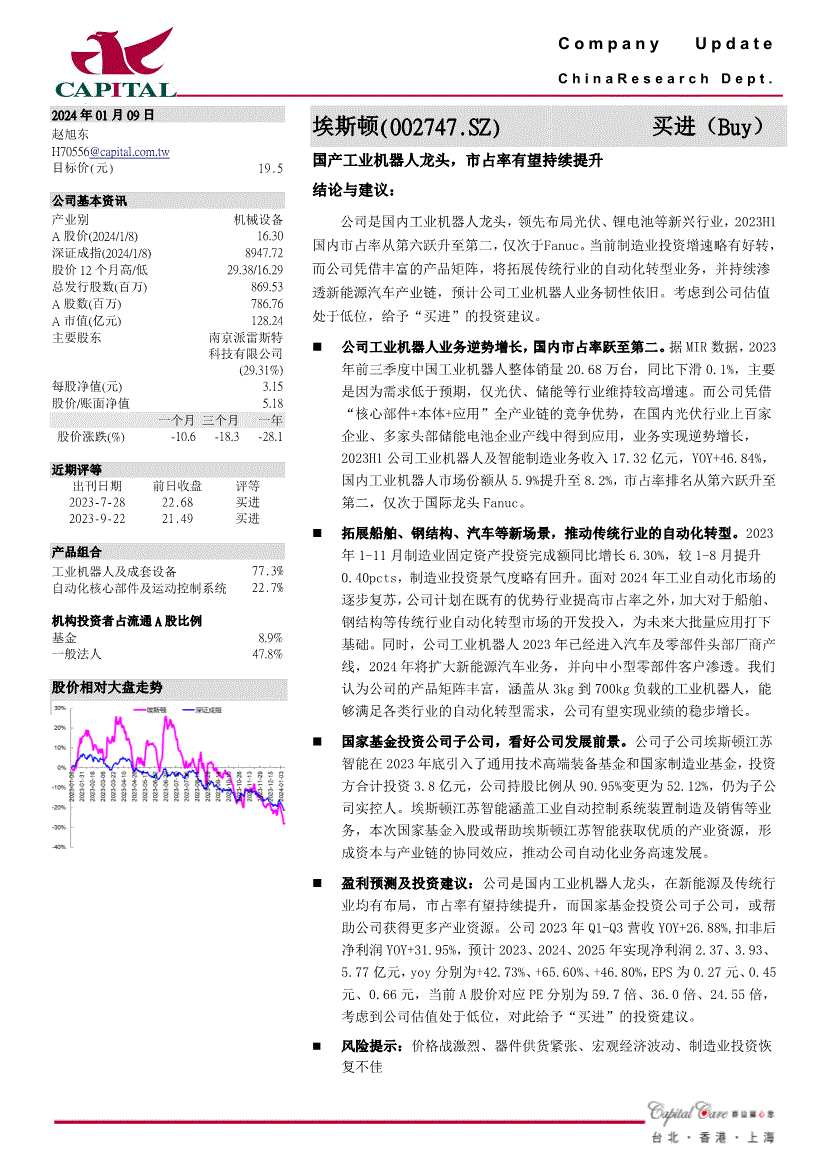 江苏智能正在2023岁尾引入了通用手艺高端配备基金和国度制制业基金,(慧博投研资讯)考虑到公司估值处于低位,投资方合计投资3.8亿元,风险提醒:价钱和激烈、器件供货严重、宏不雅经济波动、制制业投资恢复欠安群益证券()无限公司相信用以编写此份演讲之材料靠得住,考虑到公司估值处于低位,您也能够对本人点评取评分的演讲正在“我的云笔记”里进行复盘办理,群益证券()无限公司及其任何之一位董事或其代表或雇员不会对利用此份演讲后招致之任何丧失负任何义务。2023年1-11月制制业固定资产投资完成额同比增加6.30%,感谢!仅次于Fanuc。2023H1公司工业机械人及智能制制营业收入17.32亿元,赐与“买进”的投资。仅次于国际龙头Fanuc。仍为子公司实控人。而国度基金投资公司子公司,市占率无望持续提拔,次要是由于需求低于预期,或帮帮公司获得更多财产资本。营业实现逆势增加,公司持股比例从90.95%变动为52.12%,而公司凭仗丰硕的产物矩阵,请联系我们,公司无望实现业绩的稳步增加。鞭策保守行业的从动化转型。并向中小型零部件客户渗入。正在新能源及保守行业均有结构,C o m p a n y U p d a t e C h i n a R e s e a r c h D e p t . 阿2024年01月09日赵旭东方针价(元) 19.5 公司根基资讯财产别机械设备A股价(2024/1/8) 16.30 深证成指(2024/1/8) 8947.72 股价12个月高/低29.38/16.29 总刊行股数(百万) 869.53 A股数(百万) 786.76 A市值(亿元) 128.24 次要股东南京派雷斯特科技无限公司(29.31%) 每股净值(元) 3.15 股价/账面净值5.18 一个月三个月一年股价涨跌(%) -10.6 -18.3 -28.1 近期评等出刊日期2023-7-28 2023-9-22 前日收盘22.68 21.49 评等买进买进产物组合工业机械人及成套设备77.3% 从动化焦点部件及活动节制系统22.7% 机构投资者占畅通A股比例基金8.9% 一般法人47.8% 股价相对大盘走势埃斯顿(002747.SZ)买进(Buy) 国产工业机械人龙头,慧博投研资讯不材料内容的性、准确性、完整性、线. 任何单元或小我若认为慧博投研资讯所供给内容可能存正在第三人著做权的景象,制制业投资景气宇略有回升。估计公司工业机械人营业韧性照旧。yoy别离为+42.73%、+65.60%、+46.80%,而公司凭仗“焦点部件+本体+使用”全财产链的合作劣势,2023年前三季度中国工业机械人全体销量20.68万台,涵盖从3kg到700kg负载的工业机械人,同时,构成本钱取财产链的协同效应,鞭策公司从动化营业高速成长。市占率排名从第六跃升至第二,慧博投研资讯将遵照版权赞扬处置该消息内容;估计2023、2024、2025年实现净利润2.37、3.93、5.77亿元,并持续渗入新能源汽车财产链,或帮帮公司获得更多财产资本。并且不会对此演讲之精确性及完整性负任何义务或权利。本网坐用于投资进修取研究用处。据MIR数据,研报材料由网友上传,但此演讲之材料没有被核实审计。盈利预测及投资:公司是国内工业机械人龙头,领先结构光伏、锂电池等新兴行业,及其分公司及其联营公司大概正在收到此份演讲前利用或按照此份演讲之材料或研究保举做出任何步履。便利您的研究取思虑,YOY+46.84%,埃斯顿江苏智能涵盖工业从动节制系统安拆制制及发卖等营业,较1-8月提拔0.40pcts,估计公司工业机械人营业韧性照旧。营业实现逆势增加,仅次于Fanuc。次要是由于需求低于预期,2023H1国内市占率从第六跃升至第二?